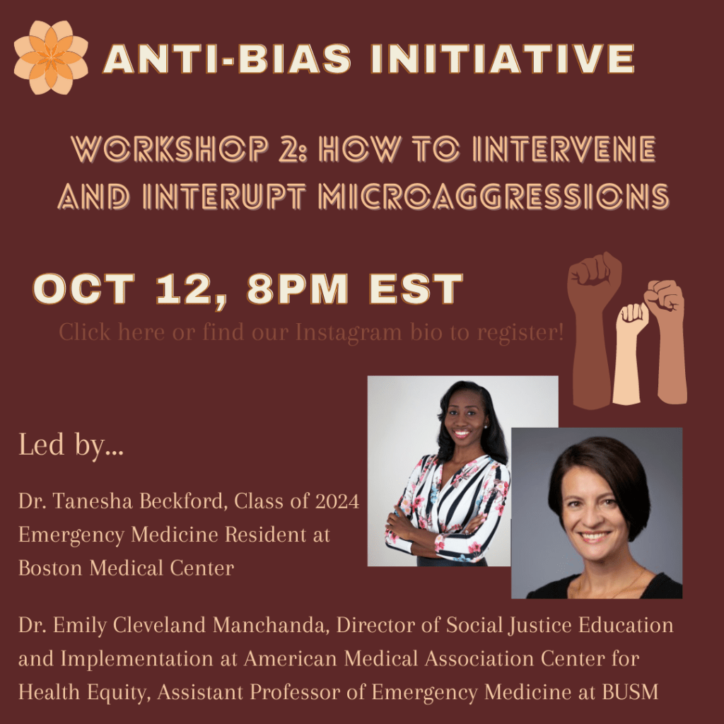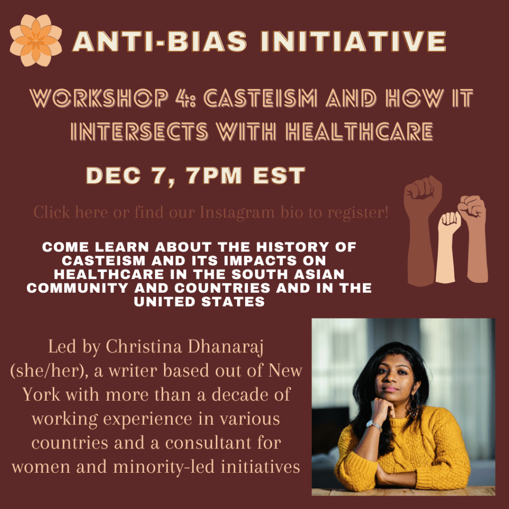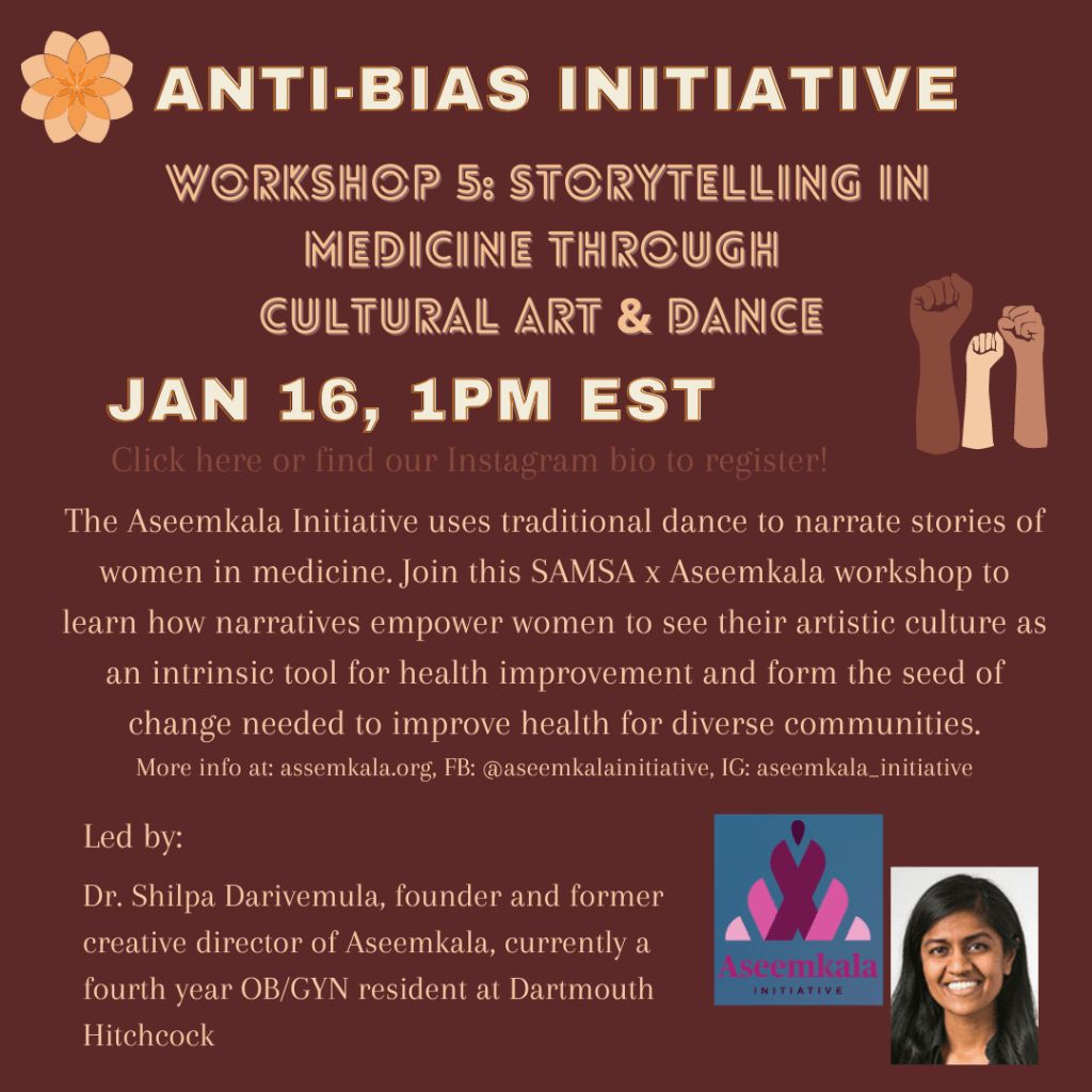 This past semester, we have held monthly zoom events in the following topics: Understanding the Sordid History of Race-Based Pseudoscience, Microaggressions Training, Cultural Competence and a Patient Panel Collaborating with SNMA, Casteism in Healthcare, and Storytelling in Medicine. A sample of our marketing materials are attached below. Going forward, we would love to hear from you: what can we, as a South Asian organization of medical students, uniquely offer students during their medical training?